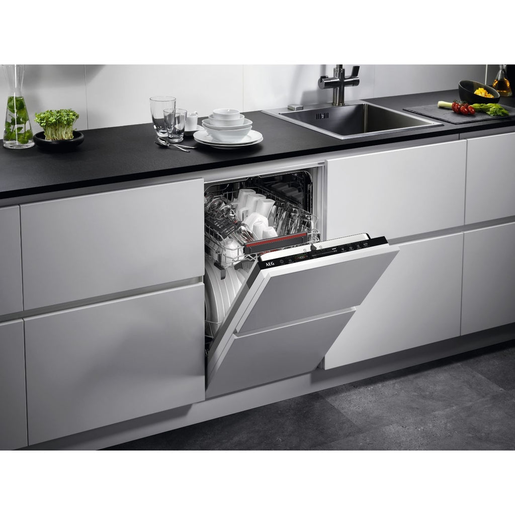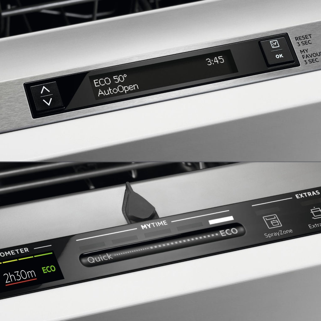 This AEG dishwasher makes daily life easier. Quickly pick your wash cycle with the simple touch slider, and an Ecometer helps you choose options that save energy and water, cutting down your bills. For really dirty items, the XtraPower option gives an extra boost. When the wash is done, AirDry opens the door a little to dry dishes naturally, saving energy. A clever light on the floor shows if it's running or finished, so you always know. With options like a quick 30-minute wash and a delay start, it fits around your busy schedule, giving you clean dishes with less fuss.