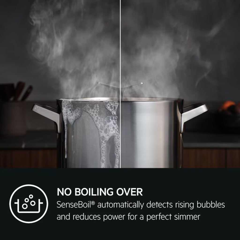 The SenseBoil function detects rising bubbles and automatically adjusts the temperature to prevent pans from boiling over.