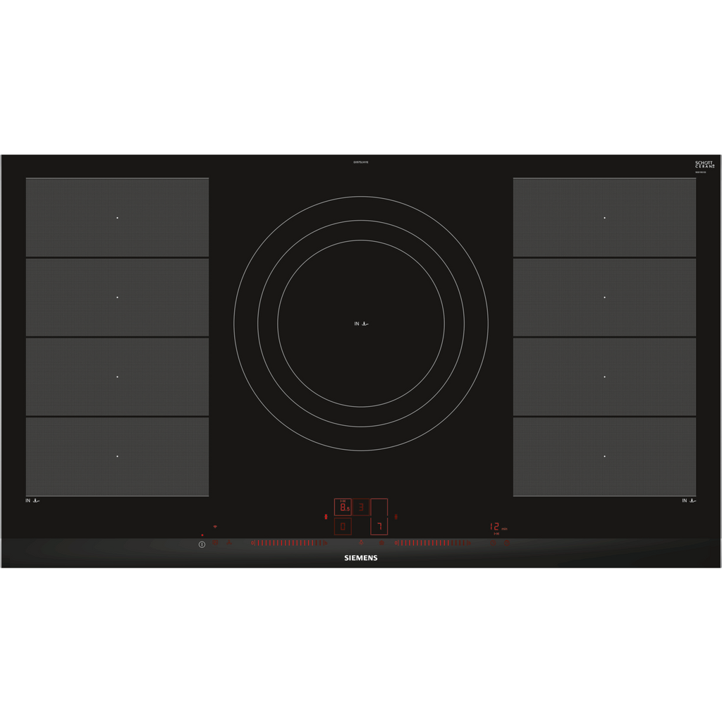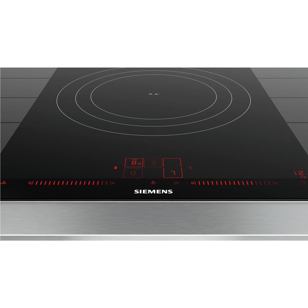 The Siemens iQ700 EX975LVV1E is a 90cm wide 5-zone induction hob with 2 flexInduction zone that lets you combine 2 zones to heat larger pans and a large central extendable triple ring zone that can accommodate pans up to 32cm in diameter perfect for paella pans. The intuitive slider touch controls allow you to set the power level for each zone, set the built-in timer, and access the features of the hob such as the fryingSensor that lets you set a target temperature and the heat will remain constant perfect for melting butter or chocolate, preparing sauces, or frying steaks. This smart hob can be connected to the Home Connect app to let you integrate your hob with your cooker hood and have them sychronise.