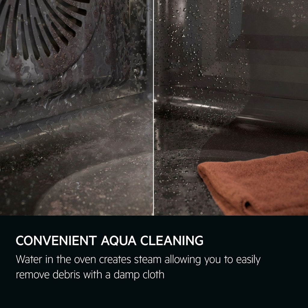 Clean your oven naturally and easily with Aqua Cleaning. Adding water in the oven creates steam to loosen stubborn residue left on the surface, allowing you to easily remove it with a damp cloth.