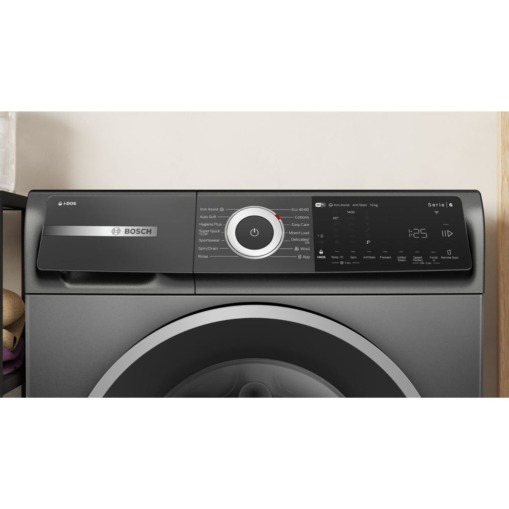Make laundry day easier with the Bosch Series 6 washing machine, in modern cast iron grey finish. This family-sized appliance has an extra-large 10kg drum capacity, so it can easily handle large loads, tackling duvets and bedding in one go while saving you time and money. The smart i-DOS system automatically measures the perfect amount of detergent for each wash, while Speed Perfect technology cuts washing time without compromising on results. When you're really in a hurry, the Super Quick 30 wash cycle delivers fresh clothes in just half an hour.