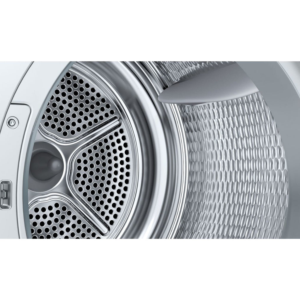 Need clothes fast? Speed Perfect gets them ready quicker. The Self-Cleaning Condenser keeps the dryer working at its best without you lifting a finger. Choose from 16 programmes, including Super Quick 40' for a rapid dry or Hygiene Plus for extra care. Plus, Anti-Vibration Walls mean quieter drying, and the Reduced Ironing option helps you spend less time at the ironing board. Add forgotten items with Reload or set a Start Delay to dry when it suits you. This Bosch tumble dryer makes home life simpler and more efficient.